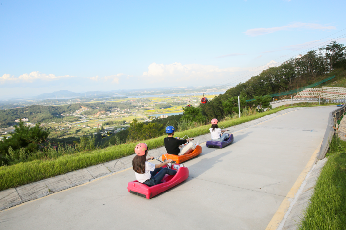 강화루지동양 최대 길이의 "루지"는 1.8km 트랙을 통해 다이나믹하게 내려올수 있으며 온가족이 함께 즐길수 있도록 흥미로운 테마로 꾸며져 있다.
